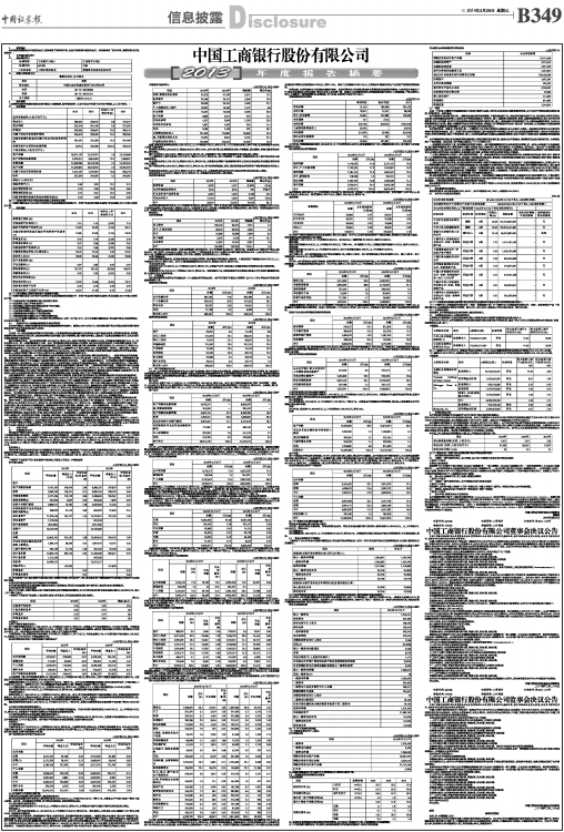 注:(1)现金分红(含税)除以当期归属于母公司股东的净利润。 3. 涉及财务报告的相关事项 8.1 与最近一期年度报告相比,会计政策、会计估计和核算方法发生变化的具体说明 √适用□不适用 主要会计政策变更 财政部于2014年颁布了修订后的《企业会计准则第9号——职工薪酬》、《企业会计准则第30号——财务报表列报》、《企业会计准则第33号——合并财务报表》以及首次制定的《企业会计准则第39号——公允价值计量》和《企业会计准则第40号——合营安排》五项企业会计准则,要求2014年7月1日起在所有执行企业会计准则的企业范围内施行,并鼓励境外上市的中国公司提前执行。本集团已于2013年度财务报表提前执行了上述新的企业会计准则。 8.2 重大会计差错的内容、更正金额、原因及其影响 □适用√不适用 8.3 与最近一期年度报告相比,合并范围发生变化的具体说明 √适用□不适用 报告期内,本行将中国工商银行(巴西)有限公司、中国工商银行(新西兰)有限公司纳入合并报表范围。 8.4 董事会、监事会对会计师事务所“非标准审计报告”的说明 □适用√不适用 4. 发布年报、摘要及资本充足率报告 本年报摘要同时刊载于上海证券交易所网站(www.sse.com.cn)及本行网站(www.icbc.com.cn,www.icbc-ltd.com)。根据中国会计准则编制的2013年度报告及中国银监会《商业银行资本管理办法(试行)》要求披露的2013年资本充足率报告亦同时刊载于上海证券交易所网站(www.sse.com.cn)及本行网站(www.icbc.com.cn,www.icbc-ltd.com)。根据国际财务报告准则编制的2013年度报告及中国银监会《商业银行资本管理办法(试行)》要求披露的2013年资本充足率报告将于适当时间刊载于香港联合交易所有限公司的“披露易”网站(www.hkexnews.hk)及本行网站(www.icbc.com.cn,www.icbc-ltd.com),其中,根据国际财务报告准则编制的2013年度报告将寄发予H股股东。 中国工商银行股份有限公司董事长 姜建清 2014年3月27日 | 证券代码:601398 | 证券简称:工商银行 | 公告编号:临2014-010号 | | 转债代码:113002 | 转债简称:工行转债 | |