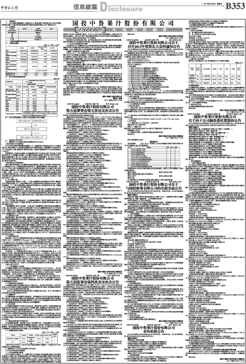 国投中鲁果汁股份有限公司(以下简称“公司”)于2014年3月14日以电邮方式向全体董事发出“公司关于召开董事会五届五次会议的通知”,并将有关会议材料通过电邮的方式送到所有董事手中。公司五届五次董事会会议于2014年3月25-26日在北京市西城区阜外大街2号万通新世界广场B座21层公司会议室以现场表决方式召开。会议应到董事11人,实到11人。公司监事会成员及公司相关高管人员列席会议。 会议由董事长郝建先生主持,符合《公司法》和《公司章程》的有关规定。与会董事对以下事项进行了认真讨论并表决,形成决议如下:
