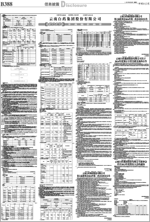 1、重要提示 本年度报告摘要来自年度报告全文,投资者欲了解详细内容,应当仔细阅读同时刊载于深圳证券交易所网站等中国证监会指定网站上的年度报告全文。 公司简介 ■ 2、主要财务数据和股东变化 (1)主要财务数据 公司是否因会计政策变更及会计差错更正等追溯调整或重述以前年度会计数据 √ 是 □ 否 ■ (2)前10名股东持股情况表 ■ (3)以方框图形式披露公司与实际控制人之间的产权及控制关系 ■ 3、管理层讨论与分析 一、概述 2013年,国内经济变化多端、人民币升值、行业竞争加剧等诸多不利因素给公司带来了持续挑战,面对纷繁复杂的经济形势,在云南白药第七届董事会的引领下,公司管理层及全体员工围绕2013年年会提出的“专业铸就品质,健康成就未来”这一年度发展主旨,努力克服困难,增强市场形势的预见与判断能力,以客户需求为中心,以提升经济效益为目标,持续变革和不断创新,推行全面质量管理,优化资源聚合平台建设,提升风险管理,加大技术创新,积极承担社会责任,打造具有竞争力和“云南白药”特色的管理运营模式,在科学决策与高效管理中确保了公司经营效果的最大化。公司的药品、健康、医药商业、中药资源等四大板块各具特色,围绕“药”这个根本推动大健康产业齐头并进、并举发展,稳步地推进传统中药与现代生活的完美融合。 2013年公司实现营业收入158.15亿元,较上年同期的138.15亿元净增20亿元,增幅为14.47%;归属于上市公司股东的净利润23.21亿元,较上年同期的15.83亿元增长7.38亿元,增幅为46.66%;各项主要经营指标全面超额完成预定目标,再创历史新高,公司经营规模、资产运行质量、收益率、市值等指标继续保持健康稳健发展。 二、主营业务分析 1、概述 2013年,是颠覆、挑战与机遇并存的一年,随着大数据时代的演进,各行各业的竞争格局发生了深度变化,医药行业也不例外。为了紧跟时代步伐,公司在坚持实施“新白药,大健康”战略的同时,遵循“以专业铸就品质,以健康成就未来”的发展精义,密切关注行业发展动态,加强对市场的研判与分析,通过把控成本、精益制造、工艺创新、优化管理、强化终端,步步为营推动公司“第二次企业再造”的稳步开展。 年内,公司继续搭建并完善其集研发创新、制造能力、管理效率、资源聚合为一体的综合服务平台,充分利用该平台完成了公司从销售到生产再到研发的倒逼式变革路径,至此,云南白药的大健康全产业链业已成型,为公司各项工作的扎实推进奠定了坚实基础。 (一)、主要工作 1、完成了药物所全部股权的收购,实现了研发资源的有效整合,解决了公司与控股股东之间存在同业竞争的情形。通过公开挂牌方式转让了云南白药置业有限公司全部股权,实现投资收益6.37亿元,有利于公司更加专注主业,为公司未来实现长期、健康、可持续发展奠定基础。 2、通过全面预算管理,在保证资金供给充足与安全的前提下,通过理财增加资金的利用效率,实现了资产的保值增值;资金预算电子审批系统不断深入,资金集中管理系统试运行,与银行合作推动电子票据推广,推动金融供应链。 3、进一步优化、完善全面绩效管理工作。对考核流程制度进行改进,修订、完善了一系列考核标准。着重开展“绩效管理信息系统”建设,并于年内顺利上线双轨试运行。 4、深化组织结构战略性重组。为推动组织的扁平化、网络化建设,公司在原有事业部制的基础上,明确划分出决策平台、核心业务平台、资源配置平台三大模块,以突显市场的核心地位,业务支持部门的资源配置速度、服务功能快速提升。 5、在云南省药物研究所基础上成立云南白药集团创新研发中心,确保云南白药的基础研究水平,并进一步提升研发的市场导向性。加快与国内外、省内外一流研究机构的合作,资源配置能力得到加强。 6、整合文山公司、丽江公司、武定种源公司、中药饮片分公司,成立中药资源事业部,建立从种植到研发、生产、销售等环节的中药资源完整产业链,力求有效克服当前中药资源相对困窘局限的状况,从根本上保证了公司生产原材料的供给。与此同时,依托公司的资源、规模、品牌等相关优势,培育新的增长点。 7、对采购流程进行全面优化,力求进一步完善采购平台以实现对上游原辅料成本的控制;上述调整使白药产业链上的每个环节,都有优势经营,改变单一经营制剂的局面,提高企业的经营抗风险能力。 8、截至2013年12月31日,公司雨花分厂已有片剂、胶囊剂、颗粒剂、散剂、丸剂、气雾剂、酊剂、软膏剂、栓剂、口服液、合剂、糖浆剂、注射剂13个剂型、16个模块通过新版GMP认证;七甸分厂已有原料药(含中药前处理及提取)通过新版GMP认证。 9、扩大公司信息化管理覆盖范围,不断更新改进现有信息化系统,继续强化对资金预算、生产、采购、行政办公等板块的信息化管理。 10、进一步推广、完善内控制度,增强全员风险意识,对公司在生产经营中可能涉及到的风险提出警示,为公司经营安全提供保障,全面提升公司预警、识别、防范、计量、评估、检测和缓释风险的能力。 11、公司在坚持以伤科圣药为根基的同时,积极践行企业社会责任使命,不断拓展“新白药,大健康”战略内涵,通过一系列深度调整,在保持稳健增长的同时,贯彻落实了国家产业转型升级的宏观政策要求,在创新研发和可持续发展