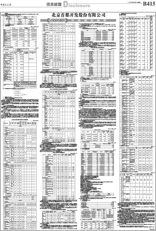 | 序号 | 公司名称 | 经营范围 | 主要产品或服务 | 持股比例% | 注册资本 | 2013年期末总资产 | 2013年期末净资产 | 2013年净利润 | | 1 | 北京城市开发集团有限责任公司 | 房地产开发 | 国风美唐、同馨家园、璞缇公馆、璞缇墅、国风华府、杭州拱墅地块、杭州下城地块等项目 | 100 | 300,000.00 | 2,544,322.18 | 574,063.30 | 79,817.71 | | 2 | 北京首开天成房地产开发有限公司 | 房地产开发 | 常青藤项目 | 100 | 10,000.00 | 295,577.33 | 79,253.94 | 63,593.88 | | 3 | 北京天鸿嘉诚房地产开发有限公司 | 房地产开发 | 回龙观G区经适房及地块 | 51 | 3,000.00 | 72,898.38 | 45,416.27 | 40,894.72 | | 4 | 北京首开荣泰置业有限公司 | 房地产开发 | 熙悦山二期项目 | 100 | 20,000.00 | 313,779.54 | 15,340.72 | -2,239.30 | | 5 | 北京首开商业地产有限公司 | 物业经营 | 华侨村底商、望京沃尔玛、铂郡商业街、璞缇商业、常青藤商业、首城国际商业等出租 | 100 | 54,674.78 | 161,884.51 | 60,362.34 | 2,518.45 | | 6 | 北京东银燕华有限公司 | 房地产开发 | 华侨村二期项目 | 51 | 3,000.00 | 150,818.89 | 14,280.62 | -7,515.75 | | 7 | 北京首开保利仁泰置业有限公司 | 房地产开发 | 大兴旧宫绿隔项目 | 51 | 50,000.00 | 132,982.72 | 49,936.72 | -63.28 | | 8 | 北京首开万科房地产开发有限公司 | 房地产开发 | 通州台湖公园里项目 | 50 | 10,000.00 | 158,433.47 | 9,339.97 | -660.03 | | 9 | 廊坊市首开志泰房地产开发有限公司 | 房地产开发 | 国风悦都项目 | 100 | 10,000.00 | 63,163.77 | 6,137.61 | -619.22 | | 10 | 太原首开龙泰置业有限责任公司 | 房地产开发 | 太原国风上观项目 | 85 | 30,000.00 | 265,460.48 | 29,798.78 | 3,657.79 | | 11 | 大连中嘉房地产开发有限公司 | 房地产开发 | 东港E15/16/17地块 | 60 | 25,000.00 | 125,115.87 | 42,221.18 | -47.12 | | 12 | 大连中美居置业有限公司 | 房地产开发 | 东港H10地块 | 95 | 19,953.60 | 168,450.03 | 41,023.94 | 9.89 | | 13 | 沈阳首开盛泰置业有限责任公司 | 房地产开发 | 国风润城项目 | 95 | 30,000.00 | 151,753.67 | 24,367.78 | -753.16 | | 14 | 沈阳首开京泰置业有限公司 | 房地产开发 | 道义区3#地块 | 100 | 5,000.00 | 39,479.30 | 4,829.86 | -0.41 | | 15 | 葫芦岛首开宏泰房地产开发有限公司 | 房地产开发 | 国风海岸项目 | 70 | 60,000.00 | 118,607.79 | 57,088.38 | -928.12 | | 16 | 苏州首开嘉泰置业有限公司 | 房地产开发 | 悦澜湾项目 | 100 | 22,000.00 | 27,765.86 | 24,651.47 | 1,451.59 | | 17 | 苏州首开永泰置业有限公司 | 房地产开发 | 班芙春天项目 | 100 | 10,000.00 | 98,053.38 | 16,445.60 | 4,371.12 | | 18 | 苏州首开融泰房地产开发有限公司 | 房地产开发 | 苏州首开常青藤项目 | 75 | 10,000.00 | 136,414.21 | 5,722.58 | -951.68 | | 19 | 苏州首开龙泰置业有限公司 | 房地产开发 | 吴江太湖一号项目 | 70 | 10,000.00 | 162,862.68 | 9,515.36 | -484.64 | | 20 | 苏州依湖置业有限公司 | 房地产开发 | 山湖一号项目 | 49 | 5,000.00 | 199,989.28 | 4,653.54 | -346.46 | | 21 | 扬州首开衡泰置业有限公司 | 房地产开发 | 水晶城、水印西堤项目 | 100 | 70,396.58 | 147,697.19 | 82,094.87 | 11,055.20 | | 22 | 海门锦源国际俱乐部有限公司 | 房地产开发 | 紫郡项目 | 100 | 4,134.34 | 89,087.09 | 729.68 | -1,149.11 | | 23 | 厦门首开翔泰置业有限公司 | 房地产开发 | 领翔国际、领翔上郡项目 | 100 | 30,000.00 | 427,760.17 | 34,165.31 | 7,824.56 | | 24 | 贵阳首开龙泰房地产开发有限公司 | 房地产开发 | 龙洞堡项目 | 100 | 20,000.00 | 222,603.80 | 16,138.88 | -1,385.81 | | 25 | 绵阳首开兴泰置业有限公司 | 房地产开发 | 仙海项目 | 100 | 20,000.00 | 72,050.85 | 16,485.06 | -1,708.61 | | 26 | 福州中鼎投资有限公司 | 房地产开发 | 保利香槟国际项目 | 40 | 10,000.00 | 498,692.30 | 3,637.57 | -2,473.59 | | 27 | 首开中庚(福州)房地产开发有限公司 | 房地产开发 | 香开新城项目 | 51 | 30,000.00 | 365,938.12 | 23,513.45 | -3,194.09 |