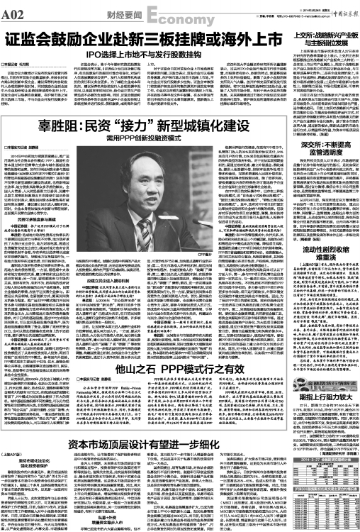 2014年中央和地方预算草案提出,推广运用政府与社会资本合作模式(PPP),鼓励社会资本通过特许经营等方式参与城市基础设施等的投资和运营。如何引导民间资本参与基础设施建设?民间资本如何在PPP模式中盈利?如何降低并规避基础设施建设的风险?这些问题不仅事关新型城镇化建设的成败,也将影响国企改革、地方债务风险等众多矛盾的解决。全国人大常委、人大财经委副主任委员、民建中央副主席辜胜阻教授近日在接受中国证券报记者专访时表示,激发民间资本积极性需打破国有资本垄断,建议建立民企进入援助机制。同时,企业本身需加强技术创新与管理创新,全面提升民营企业核心竞争力。
