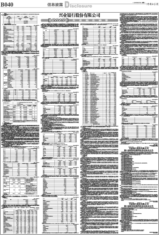 3.3 2013年度利润分配预案 根据公司法、公司章程和《2012-2014年度利润分配规划》有关规定,综合考虑监管部门有关资本充足率的要求以及公司业务可持续发展等因素,提取法定盈余公积3,175,389,458.50元,提取后的法定盈余公积达到公司注册资本的50%;提取一般准备2,402,146,465.25元;以总股本19,052,336,751股为基数,每10股派发现金股利4.6元(含税),共发放现金股利8,764,074,905.46元,结余未分配利润结转下年度。 以上利润分配预案须经公司2013年年度股东大会审议通过后两个月内实施。 四、财务会计报告 公司2013年度财务报告已经德勤华永会计师事务所(特殊普通合伙)审计,注册会计师陶坚、沈小红签字,并出具了标准无保留意见审计报告,详见年度报告全文附件。 董事长:高建平 兴业银行股份有限公司董事会 二○一四年三月二十八日 证券简称:兴业银行 证券代码:601166 编号:临2014-10 兴业银行股份有限公司 第八届董事会第四次会议决议公告 本公司及董事会全体成员保证公告内容的真实、准确和完整,对公告的虚假记载、误导性陈述或重大遗漏负连带责任。 兴业银行股份有限公司第八届董事会第四次会议于2014年3月14日发出会议通知,于3月28日在福州市举行。本次会议应出席董事15名,实际出席董事15名,其中李良温董事委托高建平董事长、张杰独立董事委托邓瑞林独立董事代为出席会议并行使表决权,保罗希尔董事以电话接入方式参加会议,符合《中华人民共和国公司法》和公司章程有关规定。公司监事会8名监事列席会议。 本次会议由董事长高建平主持,审议通过了以下议案并形成如下决议: 一、2013年度董事会工作报告; 表决结果:同意15票,反对0票,弃权0票。 二、2013年度行长工作报告; 表决结果:同意15票,反对0票,弃权0票。 三、2013年度董事履行职责情况的评价报告; 表决结果:同意15票,反对0票,弃权0票。 四、2013年度董事会战略委员会工作报告; 表决结果:同意15票,反对0票,弃权0票。 五、2013年度董事会风险管理委员会工作报告; 表决结果:同意15票,反对0票,弃权0票。 六、2013年度董事会审计与关联交易控制委员会工作报告;报告全文详见上海证券交易所网站。 表决结果:同意15票,反对0票,弃权0票。 七、2013年度董事会薪酬考核委员会工作报告; 表决结果:同意15票,反对0票,弃权0票。 八、2013年度董事会提名委员会工作报告; 表决结果:同意15票,反对0票,弃权0票。 九、2013年年度报告及摘要;报告全文详见上海证券交易所网站。 表决结果:同意15票,反对0票,弃权0票。 十、2013年度财务决算报告及2014年度财务预算方案; 表决结果:同意15票,反对0票,弃权0票。 十一、2013年度利润分配预案;根据公司法、公司章程和《2012-2014年度利润分配规划》有关规定,综合考虑监管部门有关资本充足率的要求以及公司业务可持续发展等因素,提取法定盈余公积3,175,389,458.50元,提取后的法定盈余公积达到公司注册资本的50%;提取一般准备2,402,146,465.25元;以总股本19,052,336,751股为基数,每10股派发现金股利4.6元(含税),共发放现金股利8,764,074,905.46元,结余未分配利润结转下年度。 上述2013年度利润分配预案中,现金分红金额占当年度合并报表中归属于母公司股东净利润的21.27%,分红比例持续稳步增长,较好地兼顾了满足资本监管要求、股东现金回报与未来几年的发展需求,也有利于公司加强资本积累,支持公司的长期可持续发展。 表决结果:同意15票,反对0票,弃权0票。 十二、关于聘请2014年度会计师事务所的议案;同意聘请德勤华永会计师事务所(特殊普通合伙)为公司提供2014年年报审计、半年报审阅和内部控制审计服务,审计费用(包括交通费、食宿费、文具费、通讯费、印刷费及相关的税金等)合计为人民币760万元。 表决结果:同意15票,反对0票,弃权0票。 十三、关于发行金融债券的议案;同意公司根据监管政策导向和外部市场情况,在境内和境外市场分次发行总额不超过等值于人民币800亿元的金融债券(其中在香港、台湾等境外市场发行不超过等值于人民币100亿元金融债券)。所募集资金将用于补充公司中长期资金,其中500亿元重点支持小微企业业务发展(含10亿元宝岛债用于支持海西平潭建设),300亿元重点支持绿色金融业务发展,并提请股东大会批准董事会授权管理层组织实施,授权有效期截至2015年12月31日。 表决结果:同意15票,反对0票,弃权0票。 十四、2013年度内部控制评价报告;报告全文详见上海证券交易所网站。 表决结果:同意15票,反对0票,弃权0票。 十五、2013年年度可持续发展报告;报告全文详见上海证券交易所网站。 表决结果:同意15票,反对0票,弃权0票。 十六、2013年度高级管理人员绩效薪酬分配方案;高建平、李仁杰、蒋云明、林章毅、唐斌等五位执行董事与该事项存在关联关系,回避表决。 表决结果:同意10票,反对0票,弃权0票。 十七、2010年度高级管理人员风险基金考核发放方案;高建平、李仁杰、蒋云明、林章毅、唐斌等五位执行董事与该事项存在关联关系,回避表决。 表决结果:同意10票,反对0票,弃权0票。 十八、2014年度营业办公用房购置计划;为进一步提高固定资产投资的合理性及可操作性,公司2014年度继续对房产购置实行年度预算总额控制管理,预算总金额为40亿元。在预算总金额范围内,单个项目的审批按章程规定的程序办理。 表决结果:同意15票,反对0票,弃权0票。 十