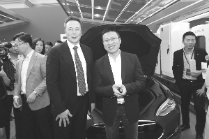 特斯拉创始人马斯克给中国首批车主颁发钥匙。 本报记者 车亮 摄