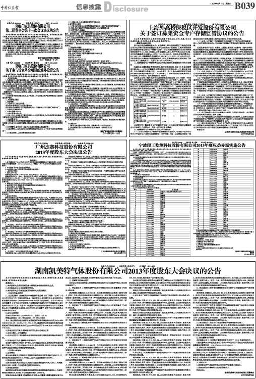 湖南凯美特气体股份有限公司2013年度股东大会决议的公告