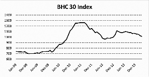 截至2014年4月末,昊樽30指数(BHC 30 Index)报收于1012.54点,较2013年3月末点数(1023.39点)下跌了-10.85点,环比跌幅-1.06%。同期,Liv-ex100指数报收于246.58点,环比下跌-2.44点,跌幅-0.98%。昊樽30指数(BHC 30 Index)追踪30款在中国市场认知高、表现相对活跃的高端葡萄酒的价格变化,用于观察高端品种市场的风向标。