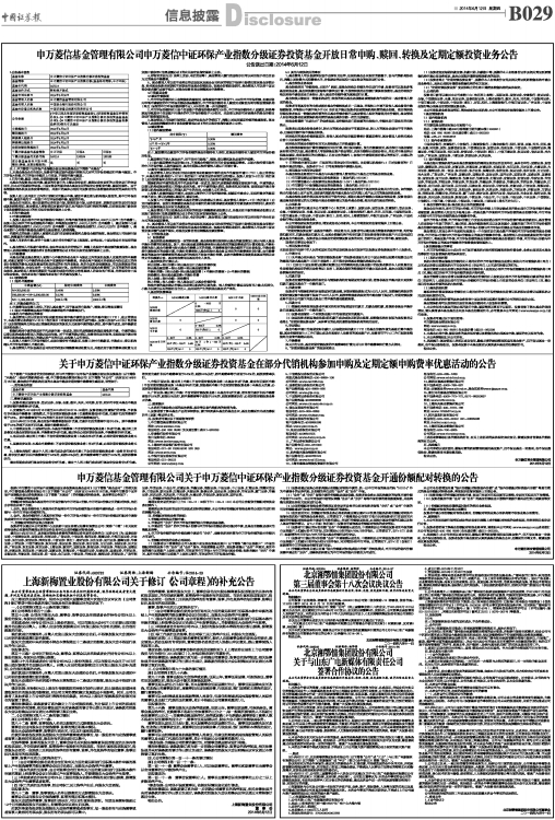 申万菱信基金管理有限公司申万菱信中证环保产业指数分级证券投资基金开放日常申购、赎回、转换及定期定额投资业务公告