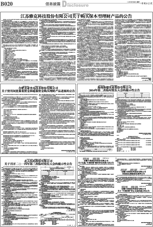 26、2014年6月11日,公司与中国农业银行宜兴市支行签订《中国农业银行股份有限公司理财产品协议》,使用人民币一千万元整购买理财产品,上述购买理财产品的情况详见刊登在2014年6月13日《证券时报》、《中国证券报》和巨潮资讯网(http://www.cninfo.com.cn)上的《江苏雅克科技股份有限公司关于购买保本型理财产品的公告》。该理财产品的到期日为2014年8月11日。