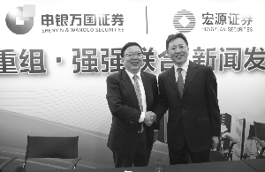 图为宏源证券董事长冯戎(右)和申银万国董事长李剑阁在发布会上。本报记者 车亮 摄
