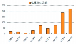 2006年以来,阳光私募基金中具有明确公开公告的分红有683次。自2009年以来,私募基金分红次数有所增多,共有30次分红,此后历年逐年增多。其中2013年、2014年私募分红次数为历年最多,分别分红188次、221次。其中,朱雀的阿尔法系列、华宝证券的华宝华兴系列产品近两年分红次数较多。比如,朱雀阿尔法2号在2013年共计分红3次,朱雀阿尔法2号与3号产品今年以来各分红两次。