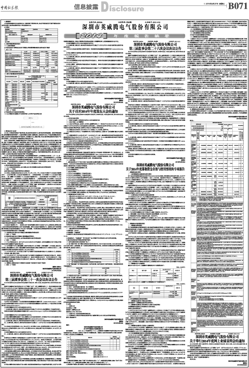 深圳市英威腾电气股份有限公司(以下简称“公司”)定于2015年4月2日(星期四)下午15:00~17:00在深圳证券信息有限公司提供的网上平台举行2014年年度业绩网上说明会,本次说明会将采用网络远程的方式召开,投资者可登陆投资者互动平台(http://irm.p5w.net)参与本次说明会。