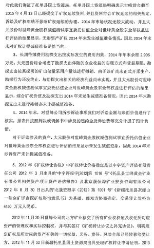 2015年4月,世峰黄金已将矿权延续申请资料报送至托里县国土资源局,托里县国土资源局已受理,并认为:采矿权延续资料齐全;资料符合矿权延续的相关规定;采矿权被冻结不影响矿权延续。