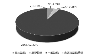 2014年度,343家上市公司共披露2345项内部控制缺陷。其中,重大缺陷96项,占比4.09%;重要缺陷77项,占比3.28%;一般缺陷2165项,占比92.32%;未区分缺陷等级的内部控制缺陷7项,占比0.30%。如图2所示。