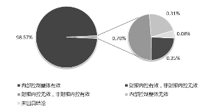 2014年度,内部控制评价结论整体有效的上市公司共2549家,占比为98.57%;非整体有效的上市公司37家,占比1.43%。内部控制评价结论非整体有效的上市公司中,9家为财报内控有效、非财报内控无效,占比0.35%;18家为财报内控无效、非财报内控有效,占比0.70%;8家为内部控制整体无效,占比0.31%;2家未出具内部控制评价结论,占比0.08%,如图1所示。