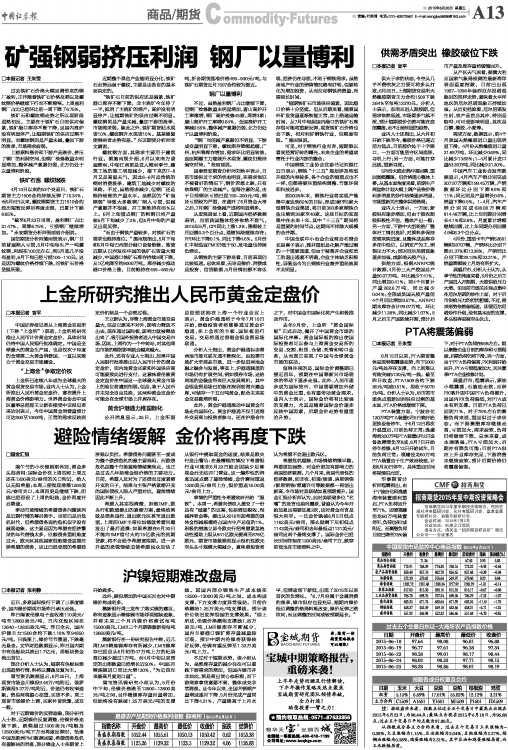 6月15日以来,PTA期货整体呈现窄幅震荡态势,向下5000元/吨处存在支撑,向上则难以有效突破5130元/吨一线。截至昨日收盘,PTA1509合约下跌26元/吨或0.51%,报收于5070元/吨。分析人士认为,后市若市场焦点重新回到供应过剩的基本面,PTA价格或继续下探。