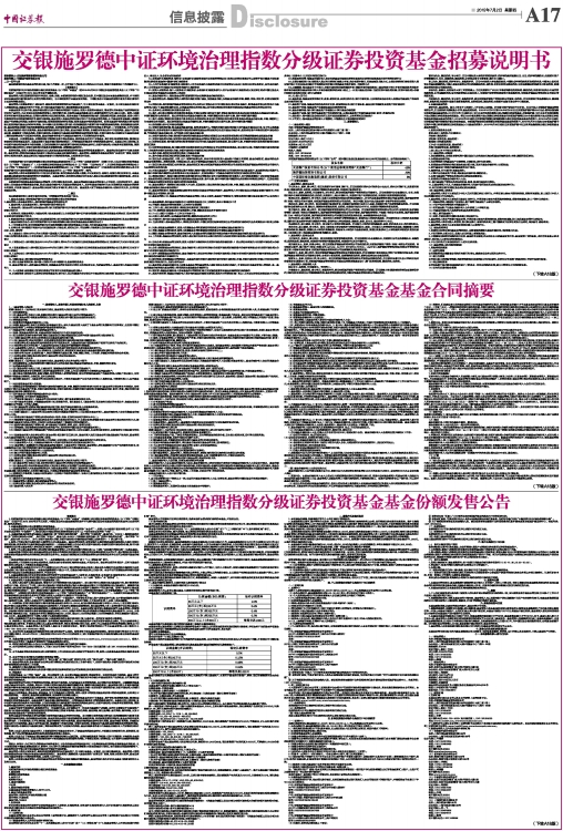 13、本公告仅对本基金基金份额发售的有关事项和规定予以说明。投资者欲了解本基金的详细情况,请详细阅读刊登在2015年7月2日《中国证券报》、2015年7月3日《上海证券报》和2015年7月6日《证券时报》上的《交银施罗德中证环境治理指数分级证券投资基金招募说明书》。