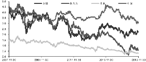 中、美、欧、日十年期国债到期收益率(%)