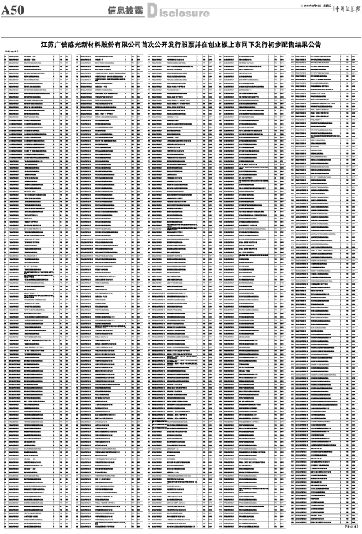 江苏广信感光新材料股份有限公司首次公开发行股票并在创业板上市网下发行初步配售结果公告