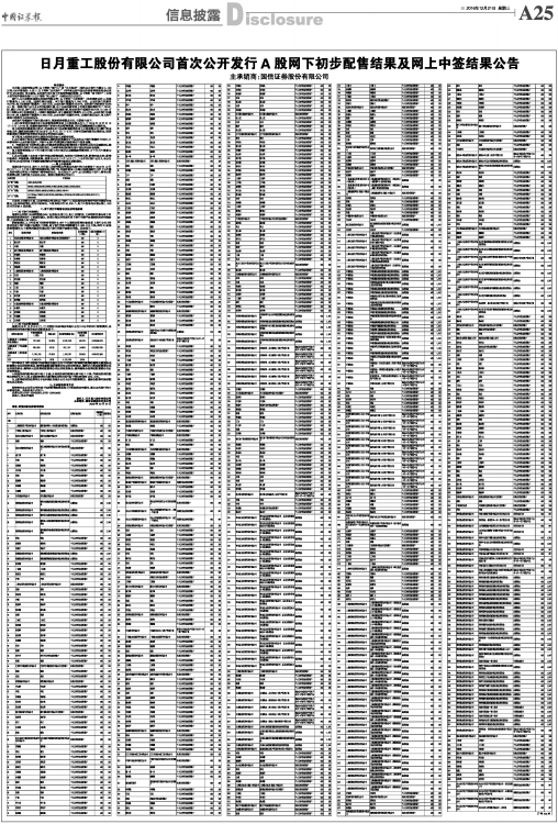 日月重工股份有限公司首次公开发行A股网下初步配售结果及网上中签结果公告