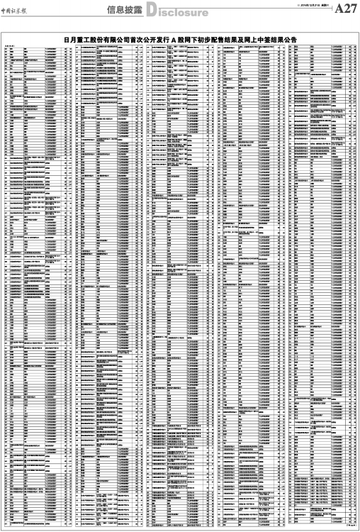 日月重工股份有限公司首次公开发行A股网下初步配售结果及网上中签结果公告