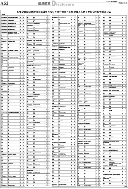 东莞金太阳研磨股份有限公司首次公开发行股票并在创业板上市网下发行初步配售结果公告