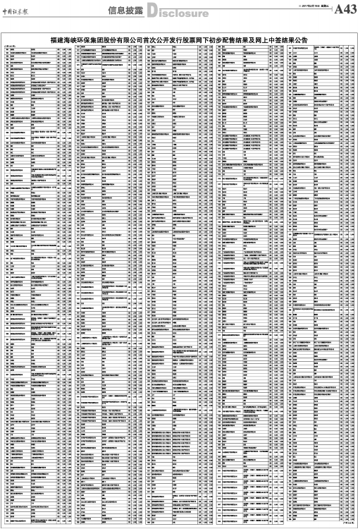 福建海峡环保集团股份有限公司首次公开发行股票网下初步配售结果及网上中签结果公告