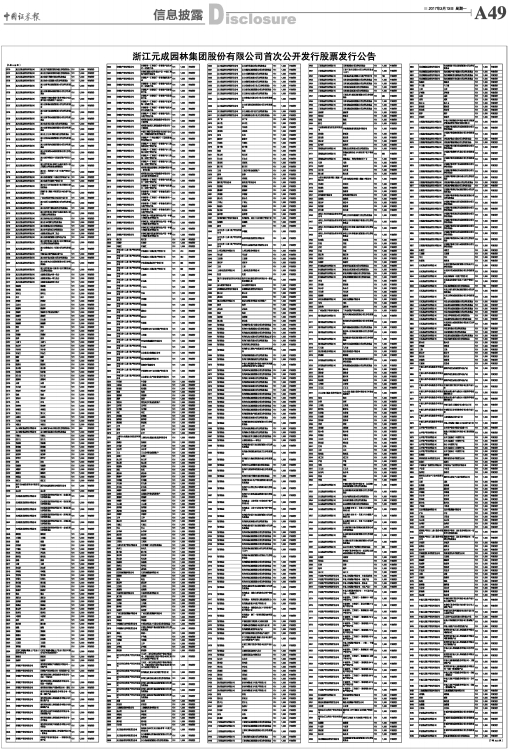 浙江元成园林集团股份有限公司首次公开发行股票发行公告