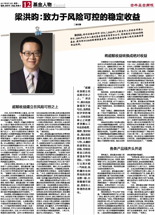 据了解,建信基金也即将陆续推出以绝对收益为目标的基金。梁洪昀介绍称,这类基金的总体思路是一部分资金投资权益类资产,借助多因子量化模型来运作管理,而剩下的一部分资金则会投到安全性较高的标的里。权益类资产的部分力争获得非负收益,即使在极端情况下,也要把亏损控制得比较有限,通过另一部分安全性较高的资产所获得的收益来垫高整个组合的收益。“这是在最坏情况下的设想。而一旦指数表现得稍有起色,即使是在中性偏负面的展望下(例如全年市场小幅下跌),加上低风险资产的收益,那么组合也大概率将获得正向回报。这就将超额收益和绝对收益有机结合起来了。”他解释。