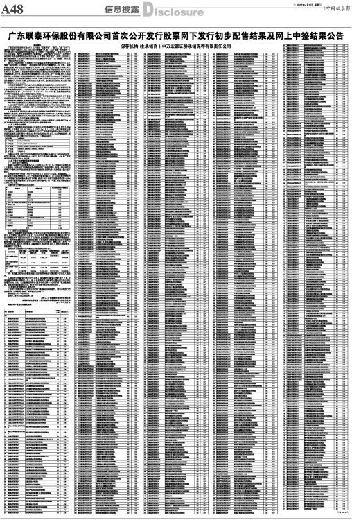 广东联泰环保股份有限公司首次公开发行股票网下发行初步配售结果及网上中签结果公告