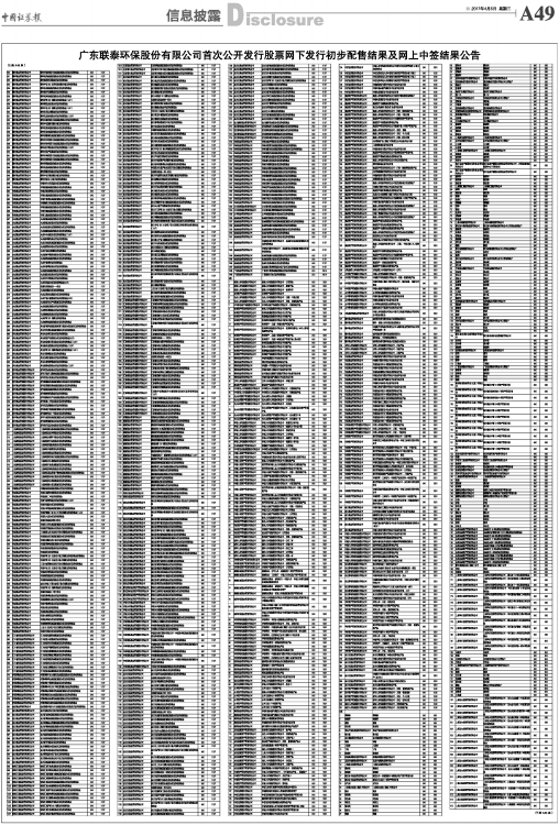 广东联泰环保股份有限公司首次公开发行股票网下发行初步配售结果及网上中签结果公告