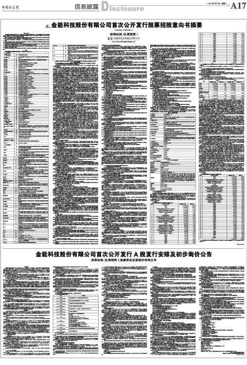 1、金能科技首次公开发行不超过7,730万股人民币普通股(A股)(下称“本次发行”)的申请已获得中国证监会证监许可[2017]523号文核准。发行人的股票简称为“金能科技”,股票代码为“603113”,该代码同时用于本次发行的初步询价及网下申购,网上申购代码为“732113”。