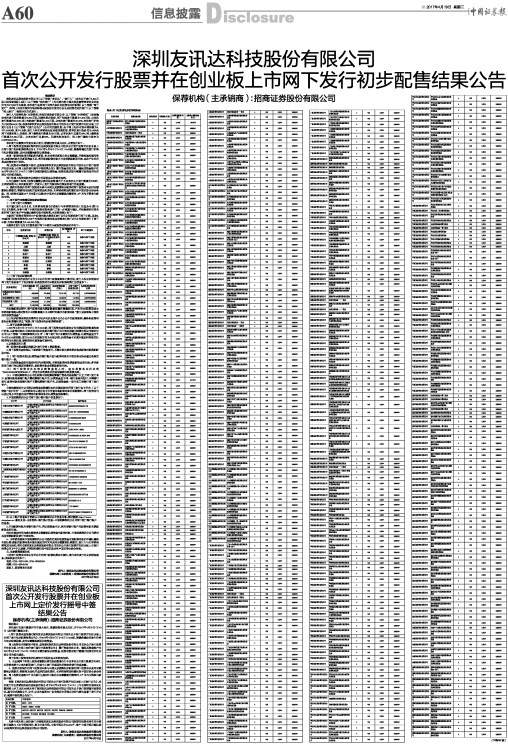 根据《深圳友讯达科技股份有限公司首次公开发行股票并在创业板上市发行公告》,本次发行的主承销商招商证券股份有限公司于2017年4月18日(T+1日)上午在深圳市福田区红荔西路上步工业区203栋主持了深圳友讯达科技股份有限公司首次公开发行股票摇号抽签仪式。摇号仪式按照公开、公平、公正的原则在广东省深圳市罗湖公证处代表的监督下进行并公证。现将中签结果公告如下: