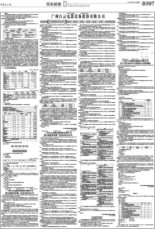 广州白云电器设备股份有限公司第五届监事会第二次会议于2017年4月20日在公司办公楼403会议室召开,出席会议的监事共5名,占全体监事人数的百分之百,会议由曾彬华主持,符合《公司法》和《公司章程》的规定,会议审议并通过现场表决方式通过了下列议案: