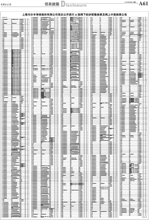 上海韦尔半导体股份有限公司首次公开发行A股网下初步配售结果及网上中签结果公告