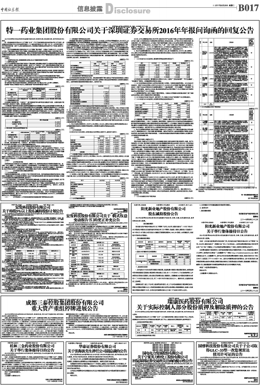 特一药业集团股份有限公司关于深圳证券交易所2016年年报问询函的回复公告