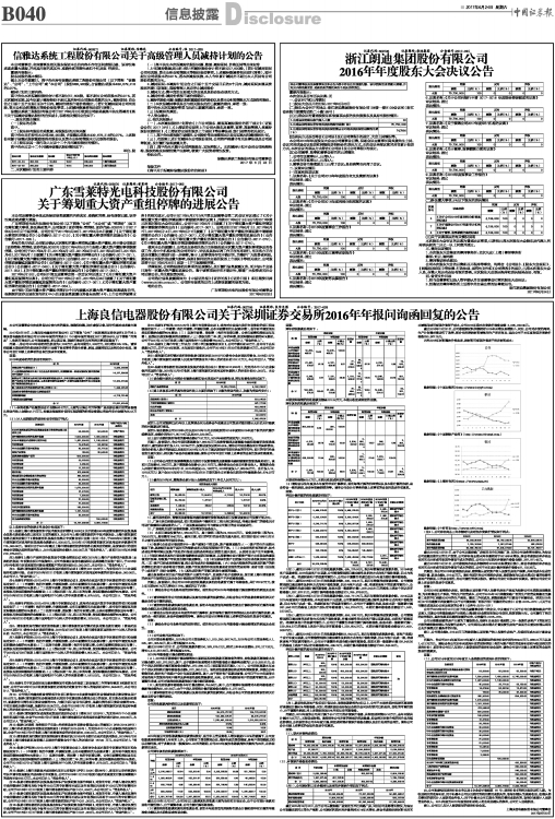 上海良信电器股份有限公司关于深圳证券交易所2016年年报问询函回复的公告