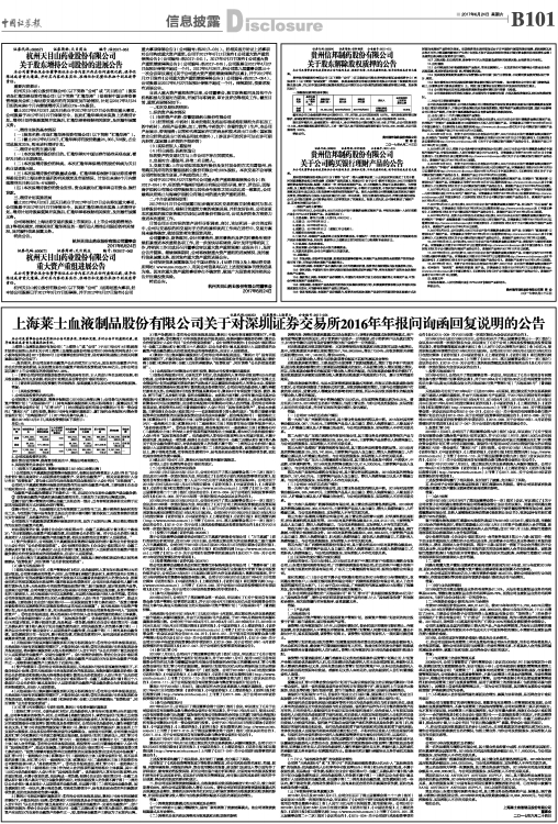 上海莱士血液制品股份有限公司关于对深圳证券交易所2016年年报问询函回复说明的公告