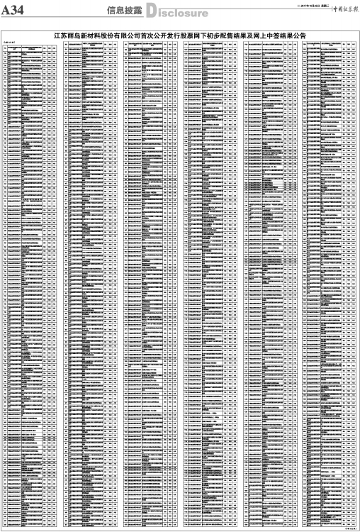 江苏丽岛新材料股份有限公司首次公开发行股票网下初步配售结果及网上中签结果公告