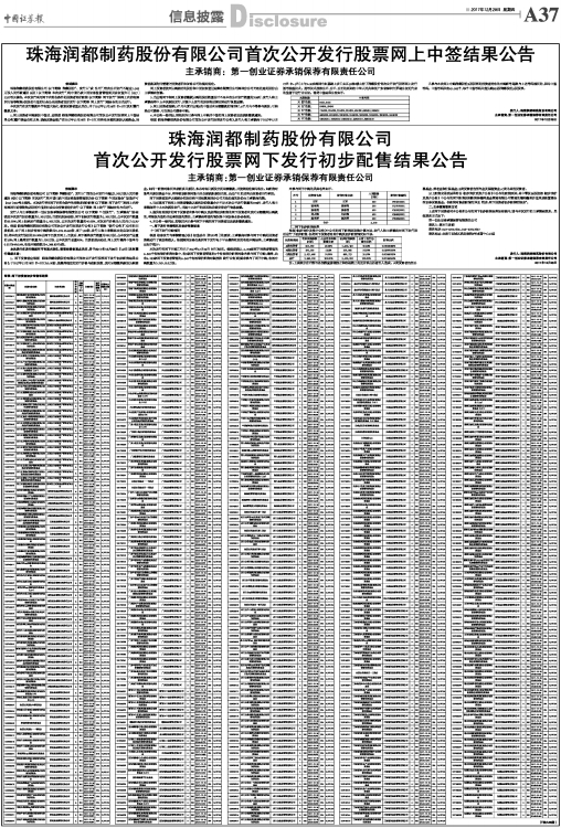 珠海润都制药股份有限公司首次公开发行股票网上中签结果公告