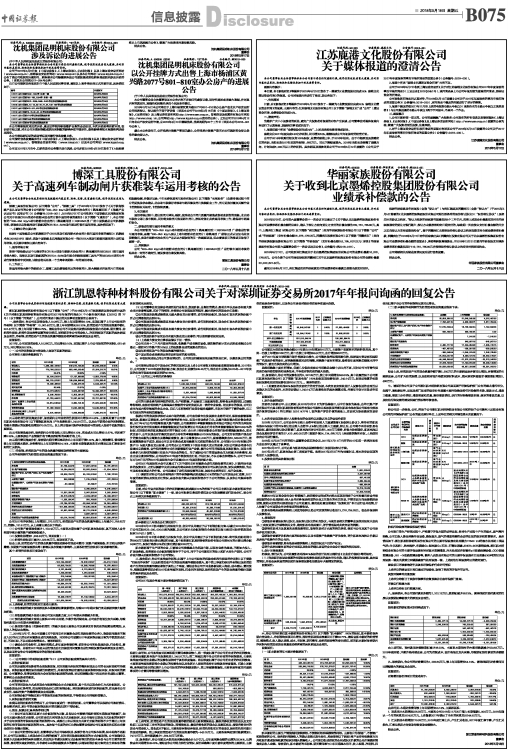 浙江凯恩特种材料股份有限公司关于对深圳证券交易所2017年年报问询函的回复公告
