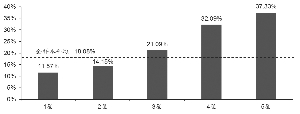 除了在择时方面困难重重,我们还发现跑赢基准也并非易事。我们考察股票仓位较高的基金相对于业绩比较基准的超额收益情况。这里我们选择成立满足27个月的主动股票管理型以及强股混合型基金进行分析。从样本基金最近两年的累积收益率与业绩比较基准的收益率来看,仅有不到45%的基金能够超越业绩比较基准。