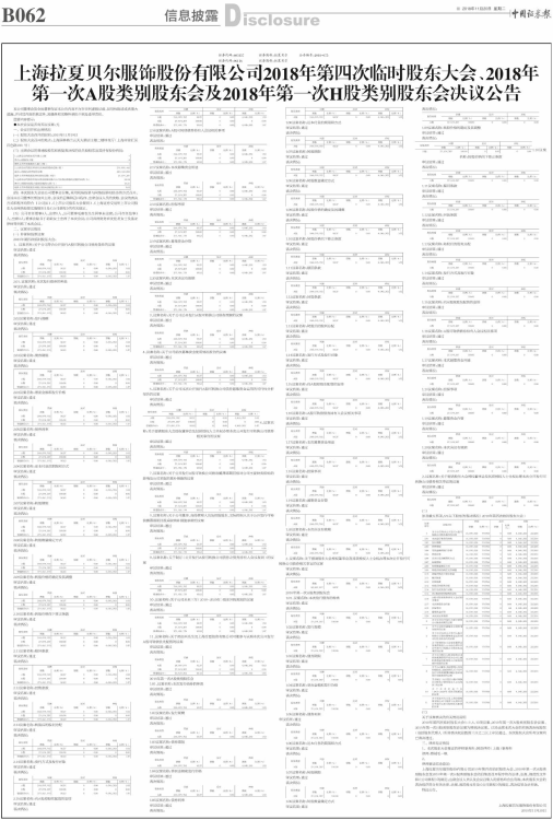 上海拉夏贝尔服饰股份有限公司2018年第四次临时股东大会、2018年第一次A股类别股东会及2018年第一次H股类别股东会决议公告