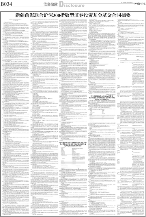 为确保新疆前海联合沪深300指数型证券投资基金增加C类基金份额符合法律、法规和《新疆前海联合沪深300指数型证券投资基金基金合同》的规定,本公司根据与基金托管人协商一致的结果,对《新疆前海联合沪深300指数型证券投资基金基金合同》(以下简称“《基金合同》”)的相关内容进行了修订。本次《基金合同》修订的内容属于《基金合同》规定的基金管理人与基金托管人协商一致后可以修改的事项,属于《基金合同》约定的调整本基金基金份额类别设置且对原有基金份额持有人的利益无实质性影响的事项,不需召开基金份额持有人大会决定,并已报中国证监会备案。《基金合同》主要修订内容如下: