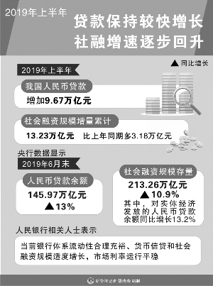 社会融资总规模明显反弹,金融对实体经济支持力度增强。上半年社会融资规模增量累计为13.23万亿元,比上年同期多3.18万亿元,同比增加较多;6月末社会融资规模存量为213.26万亿元,同比增长10.9%,较年初提高1.12个百分点,增速明显反弹。社会融资规模明显反弹的主要原因是宏观政策加强逆周期调节,在流动性保持合理充裕的条件下,金融机构加大对实体经济的融资支持力度。同时,上半年受财政减税降费、基建投资发力、住房销售保持总体平稳等因素的综合影响,实体经济融资需求也较为强劲。总之,上半年金融对实体经济支持力度明显增强,对稳定经济增长起到了显著效果。