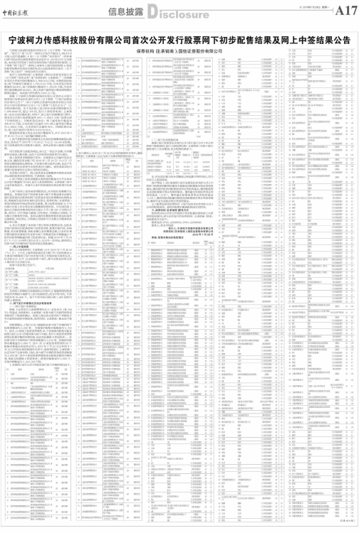 宁波柯力传感科技股份有限公司首次公开发行股票网下初步配售结果及网上中签结果公告