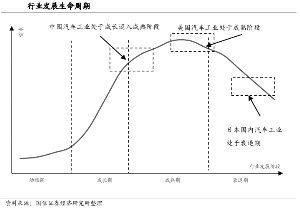 对比美国、日本,从产能、竞争者数量、行业集中度、市场增长率四个方面分析我国汽车工业发展阶段,我国传统汽车工业处于成长期向成熟期过渡的阶段。该阶段的国内汽车行业具备四大特征:产能过剩、保有量提升、销量增速放缓、分化加快。