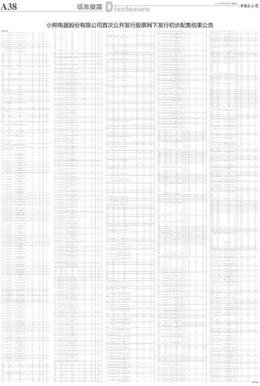 小熊电器股份有限公司首次公开发行股票网下发行初步配售结果公告
