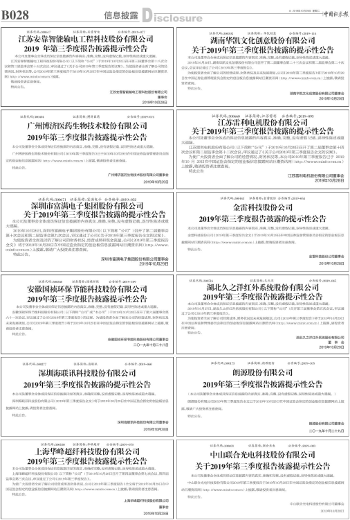 金雷科技股份公司 2019年第三季度报告披露的提示性公告 | |