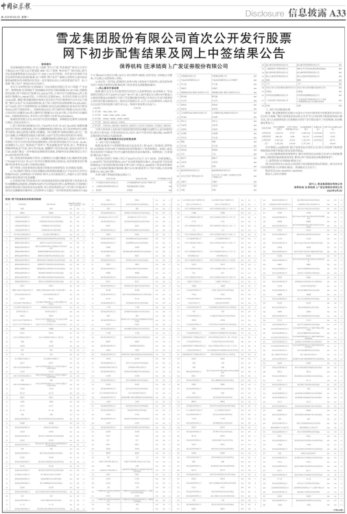 凡参与本次网上定价发行的投资者持有的申购配号尾数与上述号码相同的,则为中签号码。中签号码共有33,723个,每个中签号码只能认购1,000股雪龙集团股份有限公司A股股票。