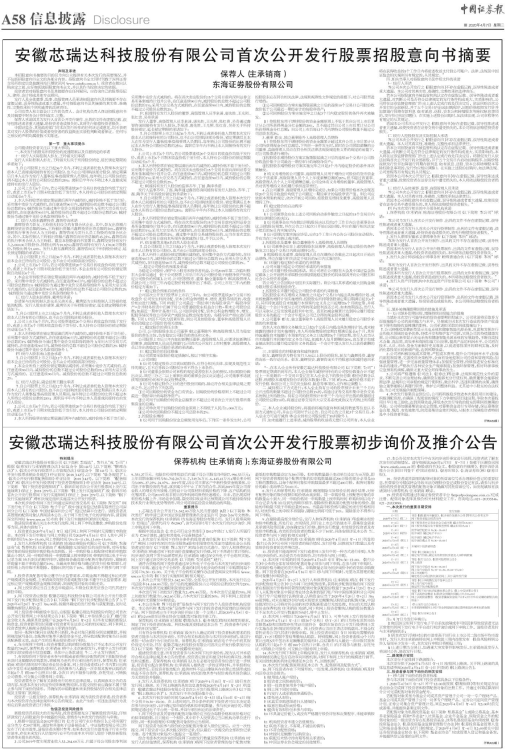 5、发行人及保荐机构(主承销商)将于2020年4月15日(T-1日)进行本次发行网上路演。关于网上路演的具体信息请参阅2020年4月14日(T-2日)刊登的《安徽芯瑞达科技股份有限公司首次公开发行股票网上路演公告》(以下简称“《网上路演公告》”)。本次发行不举办现场推介会。