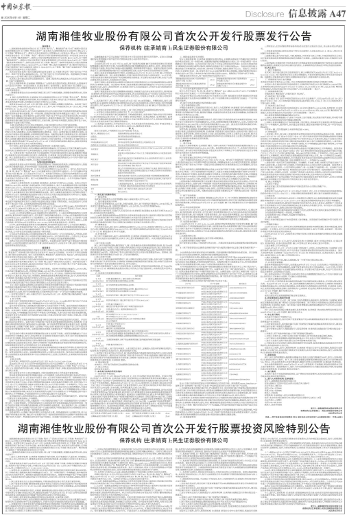 9、本公告仅对股票发行事宜扼要说明,不构成投资建议。投资者欲了解本次发行的详细情况,请仔细阅读2020年4月3日(T-7日)刊登在《中国证券报》、《上海证券报》、《证券时报》、《证券日报》上的《湖南湘佳牧业股份有限公司首次公开发行股票初步询价公告》。本次发行的招股说明书全文及相关资料可在巨潮资讯网查询。
